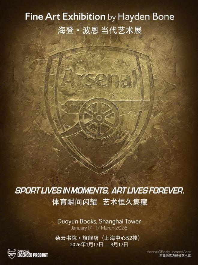 1 月 24 日英超日报,阿森纳足球俱乐部成立 139 年来首次官方授权的全球艺术展第一站,落地中国上海。在上海中心大厦 52 层的朵云书院・旗舰店内,精心布置的限量版展品涌动着激情满满的 “枪手元素”,这些艺术画作巧妙凝固足球运动的美妙瞬间,吸引全国各地的 “枪迷” 集体感受足球激情、艺术魅力的交织融合。